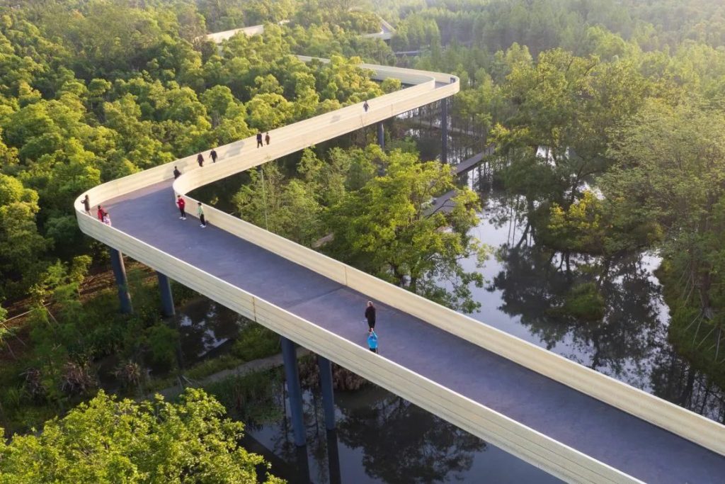材料語彙則以永續性為主軸:場地大量採用當地天然材質與預製混凝土構件,降低維護成本,同時與自然濕地肌理相容。整體設計在結構、安全與環境之間取得平衡,反映 Turenscape 一貫的「以最小人工介入喚醒自然」的哲學。