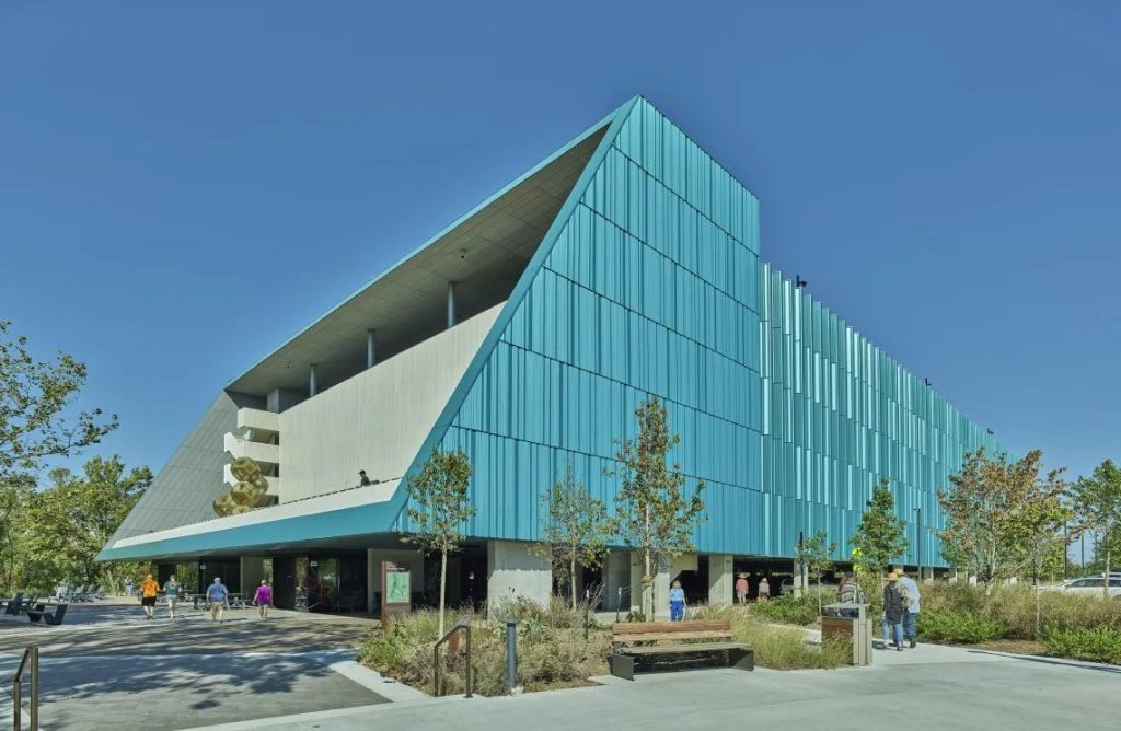 CBMAA 園區停車場由Marlon Blackwell建築事務所打造,以六層量體重新詮釋停車場的角色,成為通往水晶橋美國藝術博物館的象徵性入口指標。建築以預力混凝土形構三段式量體,並以多點垂直交通串聯周邊文化節點。最具特色的水藍色金屬垂直鰭片,於南側形成雕塑般的光影韻律,夜間在 LED 映照下散發輕盈光暈,使建築具備強烈辨識度。底層整合咖啡與零售,二樓空中露台則成為連結森林與匯聚廣場的公共平台。這座停車樓以建築語彙延伸博物館的精神,讓基礎設施轉化為富含文化氣息的公共門戶。