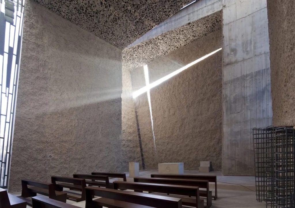 Menis 以火山地貌為靈感,以厚重、粗獷的量體回應島嶼的自然原型。巨石般的混凝土牆體在街廓中形成鮮明對比,而量體之間穿插的狹縫則以金屬與玻璃構築,使自然光得以如雕塑般切割空間。光如同一種精神語言——建築捨棄傳統窗戶,只以天頂開口與象徵性的十字架引入日光。光線隨時間游移,將空間的重心重新分配,誘導觀者在靜謐中行走、停留、沉思,讓建築成為一種緩慢且沉浸體驗的儀式。