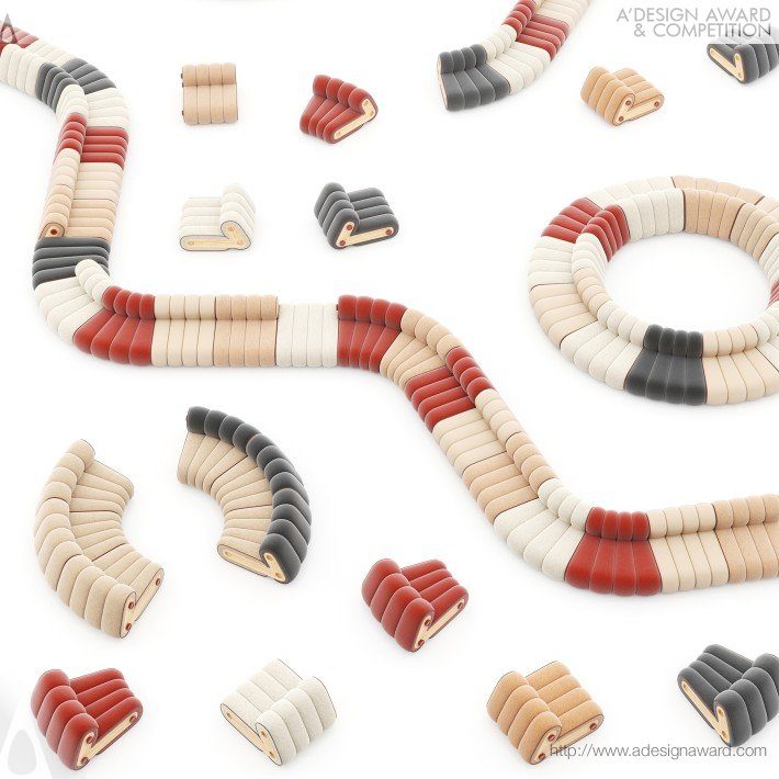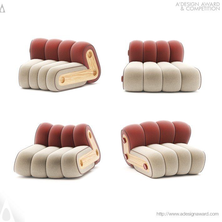 以「風箱變形」為核心概念的模組化沙發,靈感來自手風琴演奏時可伸縮的動態結構。設計將沙發的基礎模組轉化為可壓縮、可伸展的單元,只需一種模組,便能組合出多種尺寸與配置,大幅減少傳統沙發繁複的規格選擇。