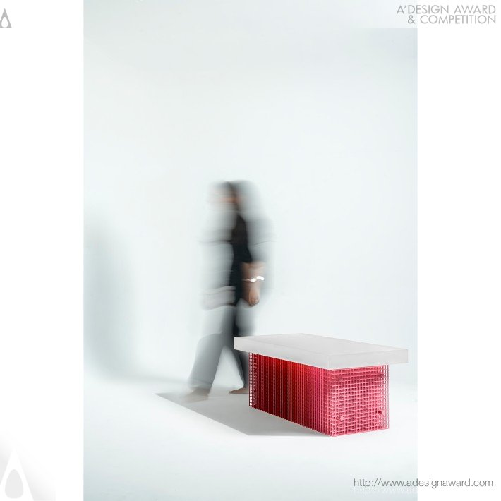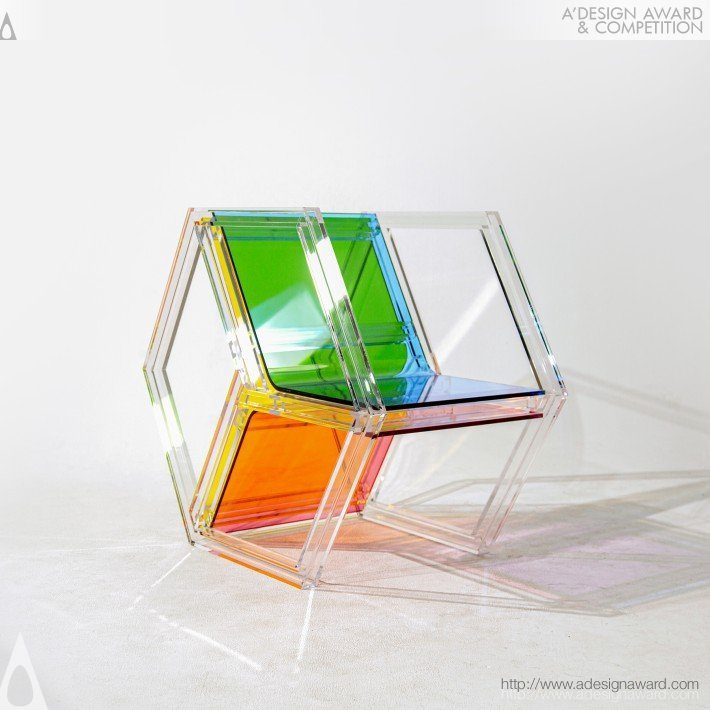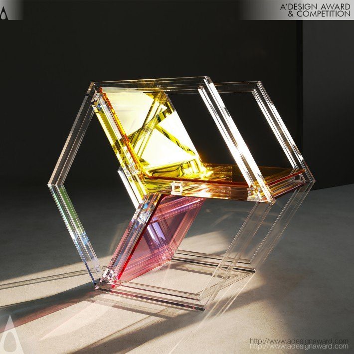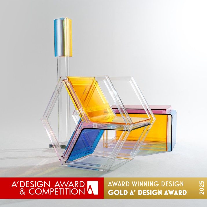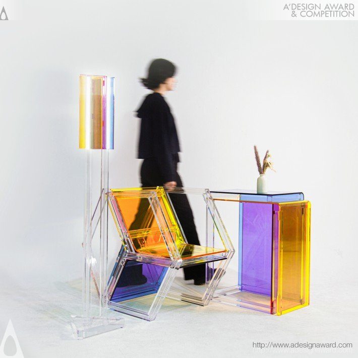 以紅、黃、藍三原色為核心的實驗性家具組,靈感來自風格派以簡馭繁的空間解構方式。設計運用透明壓克力的層疊特性,讓三原色在重疊與滾動中生成更多色彩,將色彩本身轉化為可被操作的空間元素。整組家具由六角形椅、長方形桌與三角形落地燈構成,三件作品皆以不同幾何結構交錯組合。