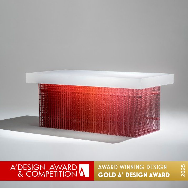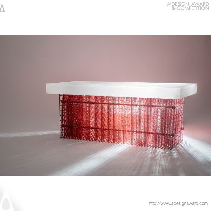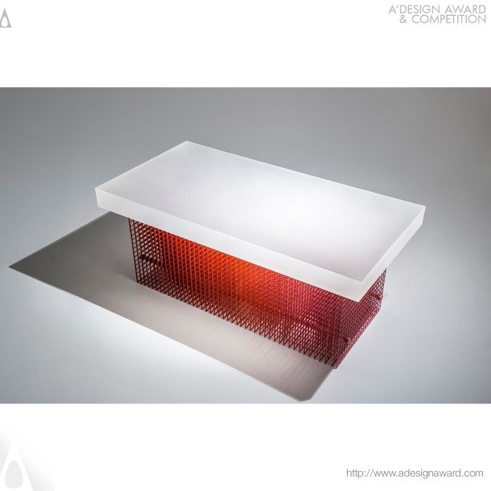精準切割的金屬網格,對比手工塗佈留下的不完美痕跡,創造出清晰與模糊並存的視覺張力。色彩隨光線與視角改變,時而聚焦、時而消散,如同情緒與記憶般短暫卻深刻。除了家具功能,還是一件關於視角、時間與情感的詩意作品,將瞬逝的感受凝結為可被長久感知的存在。