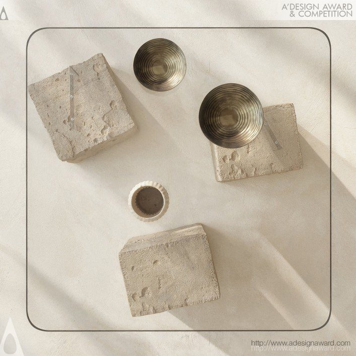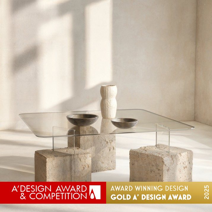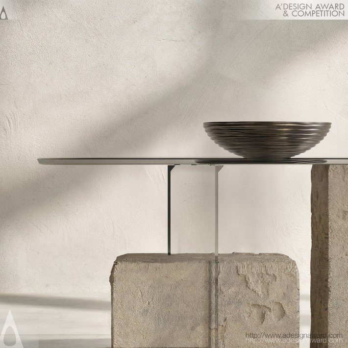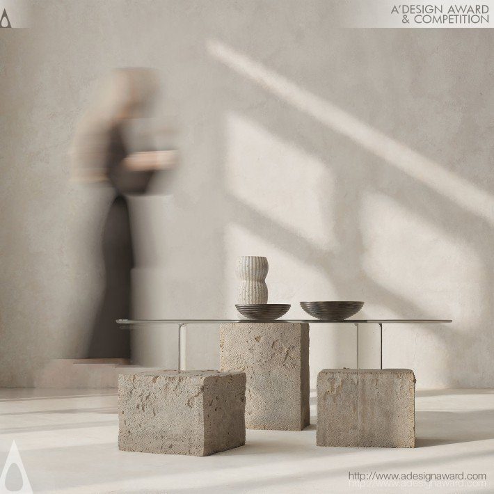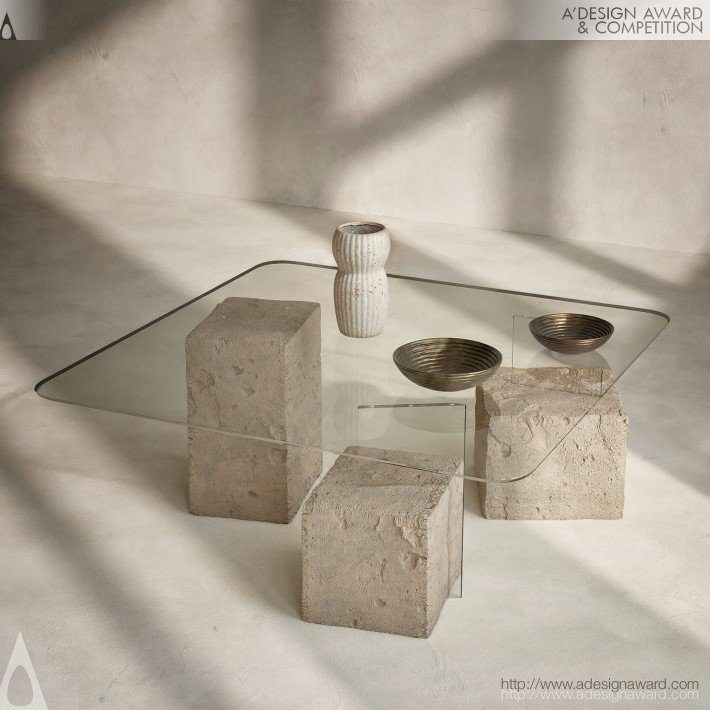 以金字塔的結構與圖拉石的歷史意象為靈感,將古老文明的厚重感轉化為當代家具語彙。設計透過三個宛如金字塔基石的量體構成桌腳,象徵穩定與永恆,上方則以透明玻璃桌面形成對比,營造出「重量與輕盈」並存的視覺張力。