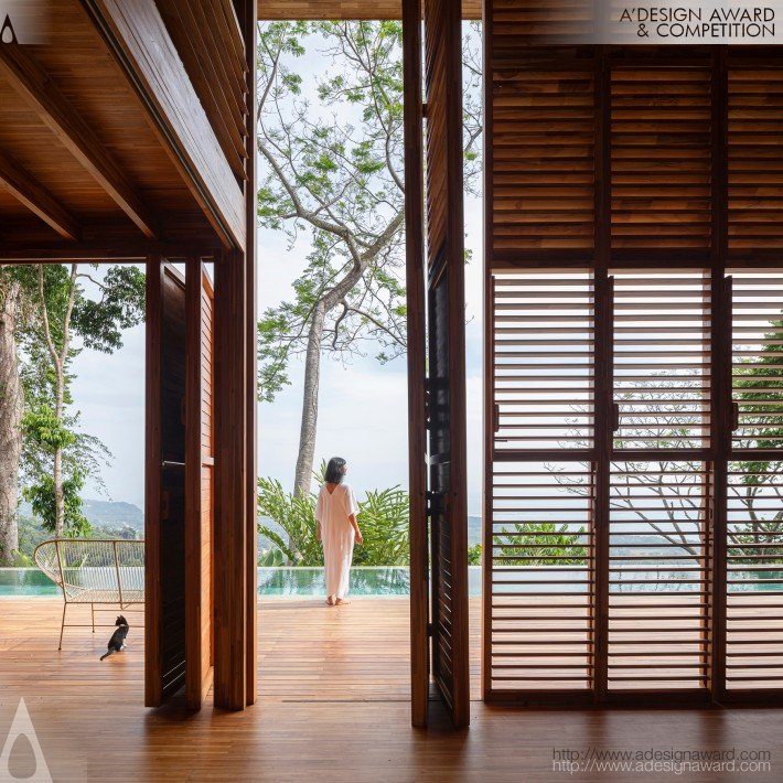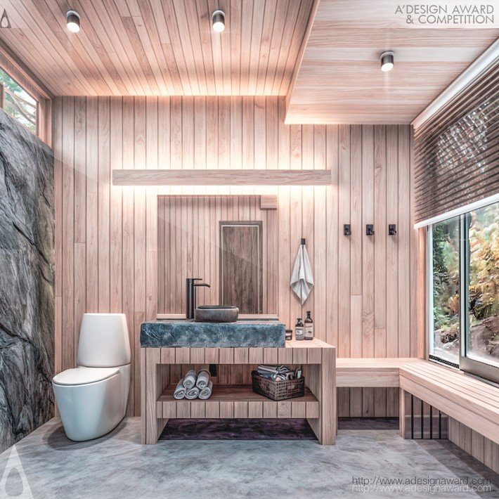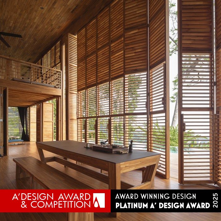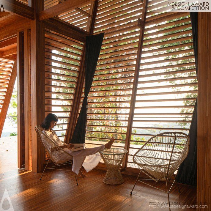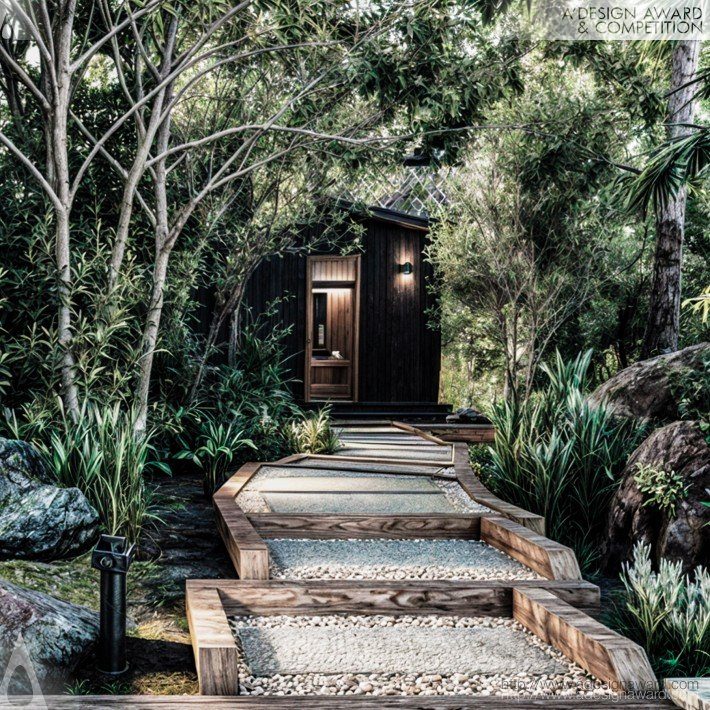 以「最小干預」為原則,保留場域中央樹木,階梯式平台順應地形,使建築與景觀無縫對接。選用當地天然石材、混凝土、回收木材與木材等低衝擊材料,追求耐久與質樸美學;採光與自然通風經生物氣候優化。