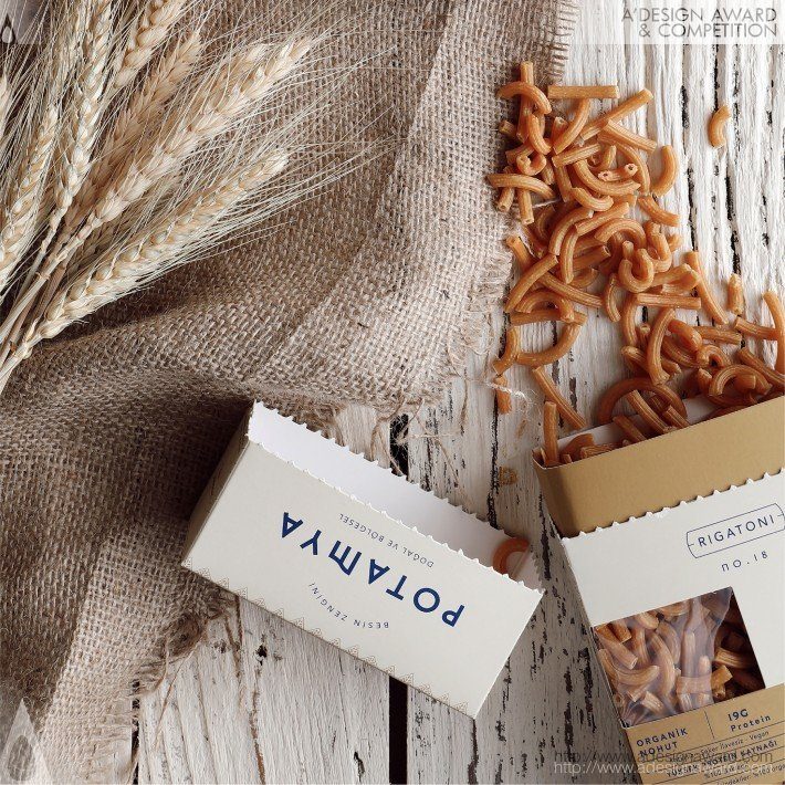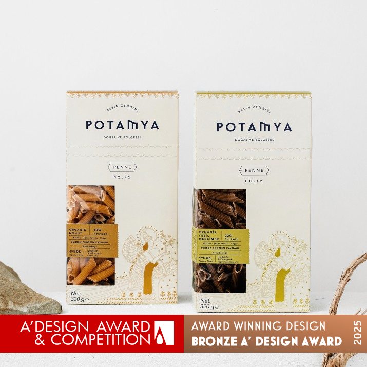 設計靈感源自古代美索不達米亞文化——農業的起源地,並以現代簡約手法重新詮釋。深藍色標誌取材自古代工具與幾何符號,插畫則致敬農業文明,為產品注入文化底蘊。作為天然有機品牌,Potamya 提供 100% 無麩質、純素食豆類意麵。包裝採用回收環保材料製作,結構經過多次原型測試,以確保耐用與生產效率。
