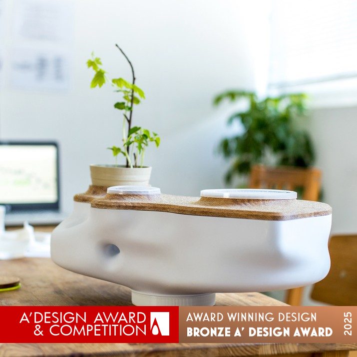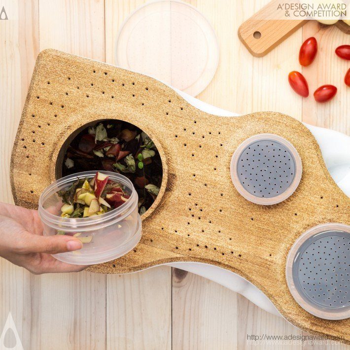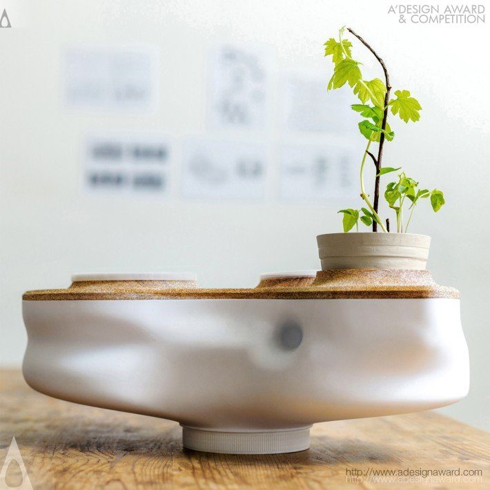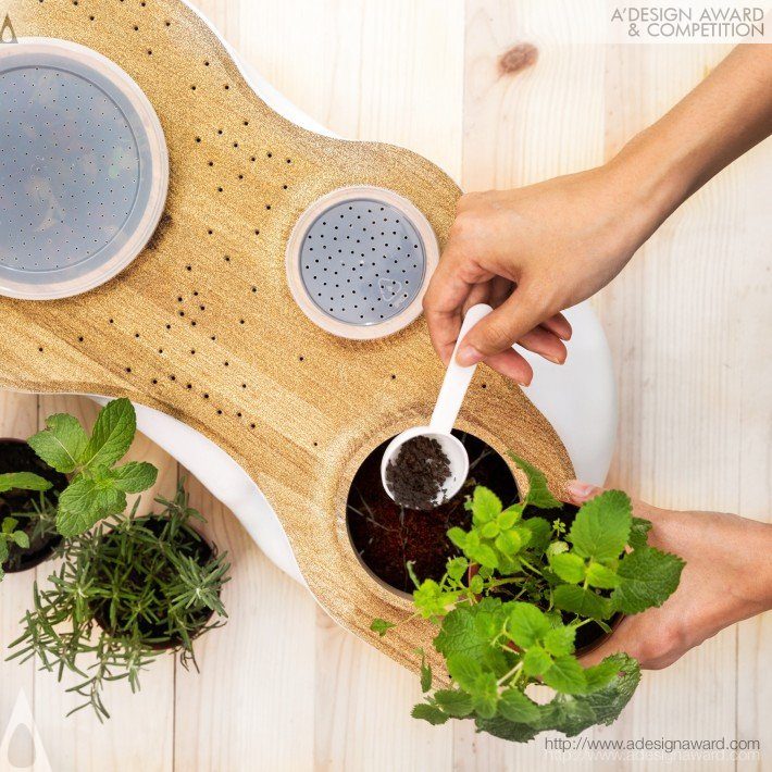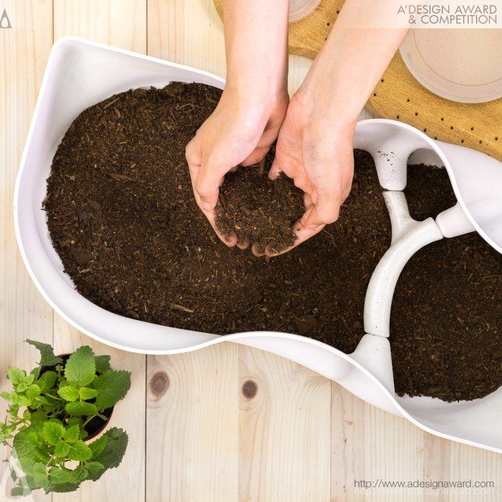 操作方式簡單:將土壤與堆肥蠕蟲放入容器,定期投入切碎食材並維持適當濕度與光照,即可持續產出生態循環。使用者可直接收集養分作為植栽肥料,完成「從廚餘到新生命」的轉化過程。外觀透過演算法模擬自然條件,讓形態最符合生物分解需求。頂蓋的通風孔依葵花籽螺旋排列,以黃金比例確保最佳透氣環境。成為結合仿生設計、永續思維與實用功能的代表,讓都市家庭也能輕鬆參與永續循環。