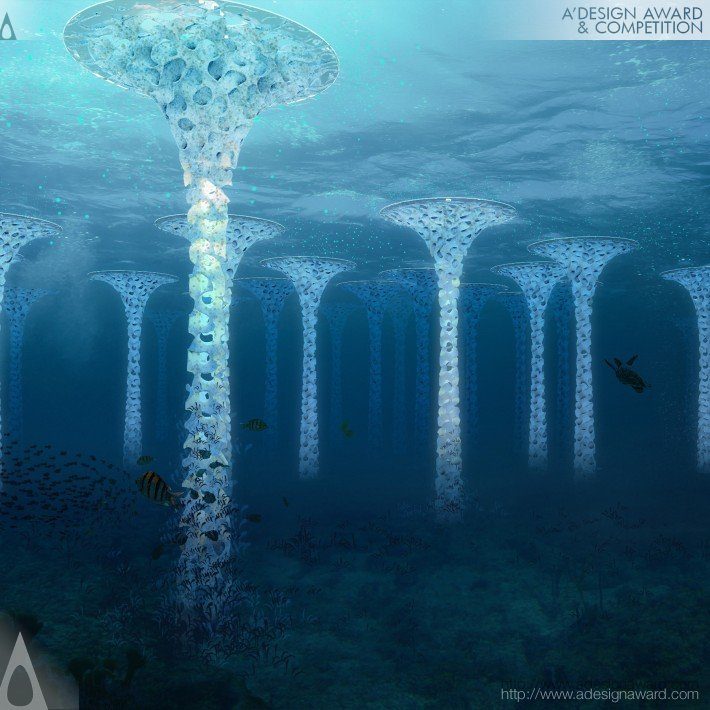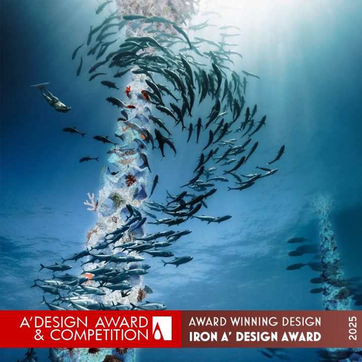 結合紀念與生態修復的概念設計,旨在將曾受核試驗摧毀的場域轉化為繁盛的海洋保護區。設計靈感源自對核災破壞的反思,以及重建生態系統的迫切需求,將人類記憶與自然更新緊密交織。核心策略包括以環保海洋混凝土與 3D 列印技術打造人工魚礁,促進珊瑚再生,並提供多樣化的海洋棲地。