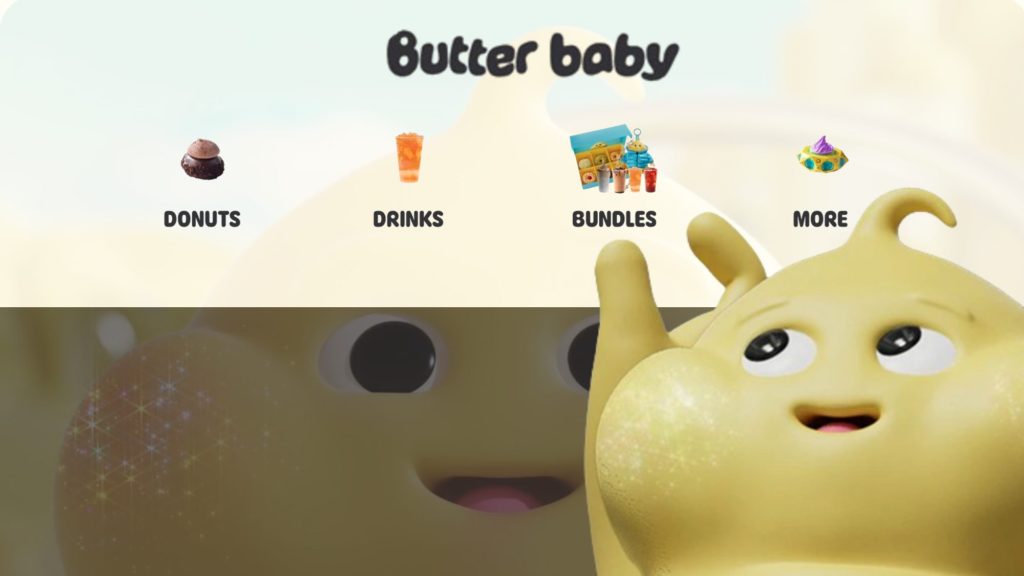 Butter Baby 這個外星角色在店內並非以插畫或商品形象呈現,而是滲透進空間佈局之中。中央的泡泡狀展示罩展示來自 Butterlandia 的「文物」,品牌角色雕像成為建築裝飾的一部分,如同星球文化的遺存碎片。