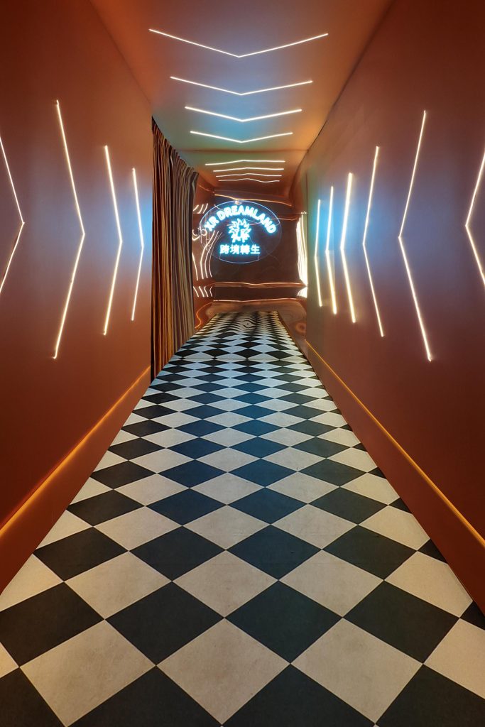 門頭與售票亭的懷舊造型設計,重新詮釋了 20世紀:50至70年代 的浪漫未來主義:流線型曲線、金屬光澤和宇宙般的憧憬,從閃耀的入口到充滿戲劇張力的售票亭和放映區,懷舊與前衛美學交織。宏偉的燈光大門、復古科幻的細節、透明的LED燈和鏡面壓克力營造出戲劇化氛圍,彷彿跨越轉生通道穿越了時空,模糊了現實與虛擬世界的界限。這種將記憶物質化的場景設計,讓觀賞展覽的同時,更能身歷其境的體驗。