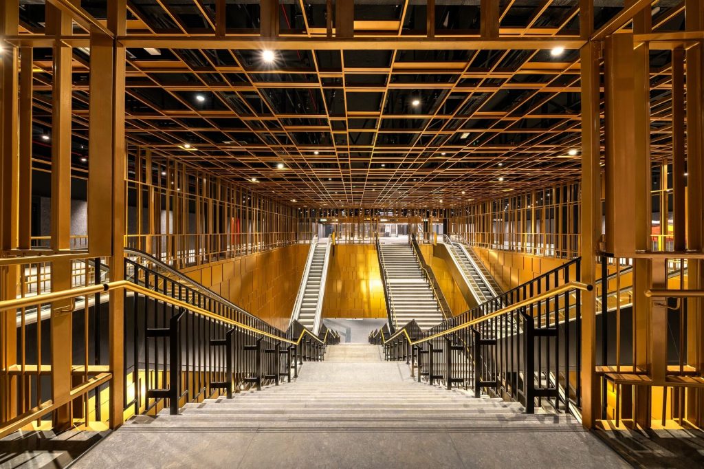 在空間組織上,站體並非單純的垂直堆疊,而是透過大型中庭與層層退縮的平面配置,將自然光引入地下,建立清晰的視覺軸線。這樣的設計不僅回應了深層地下空間容易產生的壓迫感,也讓乘客在移動過程中,能持續感知自身所處的深度與方向,使地下空間保持可讀性與方向感。