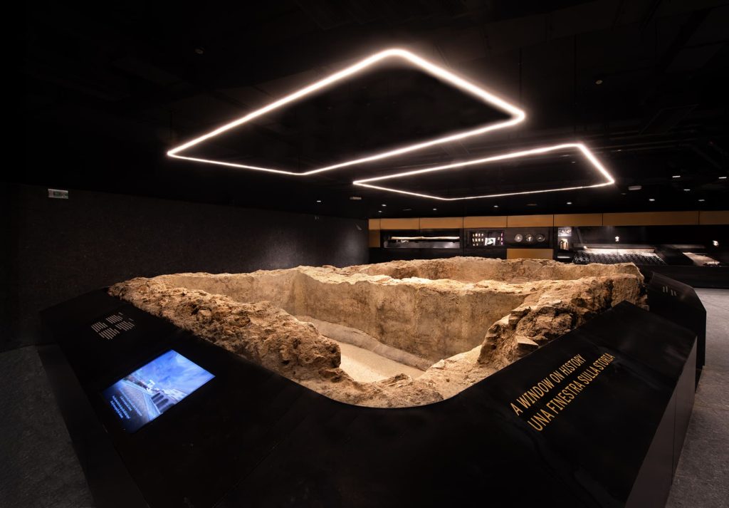 競技場站的最大特徵,在於將考古現場形塑為空間本體,而非被移置或簡化為展示品。施工期間將近 50 萬件珍貴文物相繼出土,包含古羅馬時期的住宅基址、公共設施構造與日常器物,站內保留眾多出土文物,並直接整合進站體動線之中。