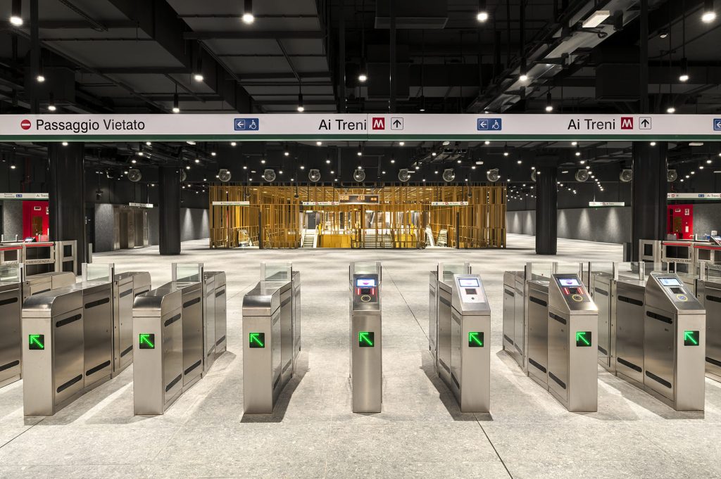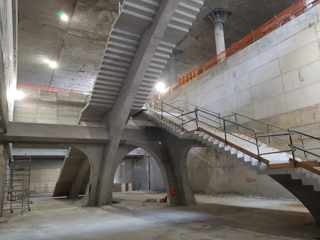 「競技場站(Colosseo-Fori Imperiali)」位於羅馬最敏感的世界遺產:羅馬競技場,距西元 1 世紀完工至今橫跨了將近約兩千年。總站體佔地表下 32 公尺深,橫向尺度長達 240 公尺。建築採用自上而下的施工工法,從上到下逐層建造樓層,在厚實的地下連續牆保護下進行開挖,施工與考古並行,以確保競技場本體與周邊古蹟及出土文物不受影響。