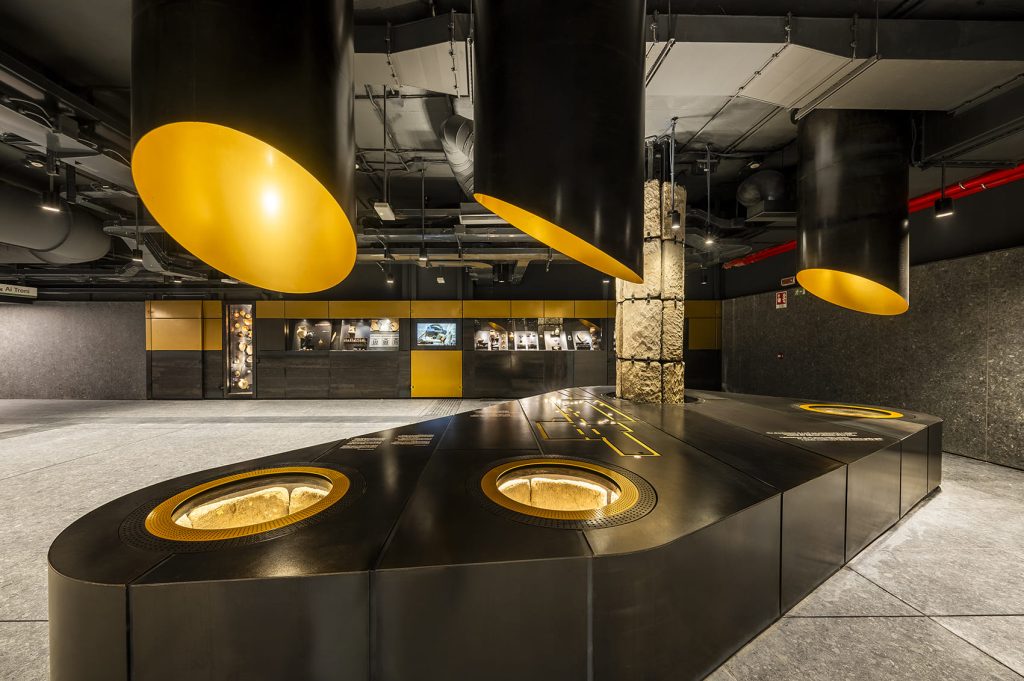 競技場站內部規劃了五個主要展示區,沿著乘客的移動路徑依序展開,形成一條可被行走的歷史剖面。展區內容涵蓋從古羅馬早期到中世紀的不同時代層位,透過原址展示、結構標示與多媒體輔助說明,呈現地層之間的關係與演變。
