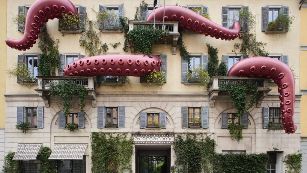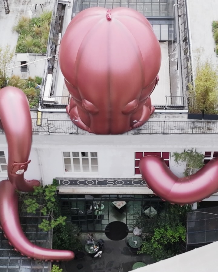 義大利品牌 Moncler 推出《Have a Puffy Summer》系列,顛覆羽絨服只能屬於冬季的印象,將標誌性的蓬鬆輪廓轉化為更輕盈靈活的夏季版本,主打即使在炎熱季節也能自在穿著羽絨單品。為強化這項概念,品牌將一隻巨型充氣章魚盤踞建築屋頂,觸手延伸至陽台、外牆甚至室內,形成強烈的視覺張力與趣味性。