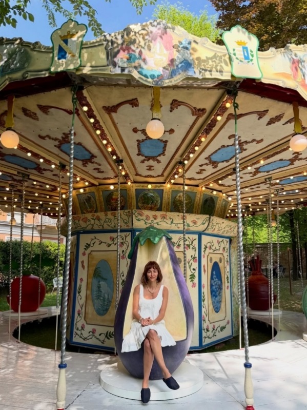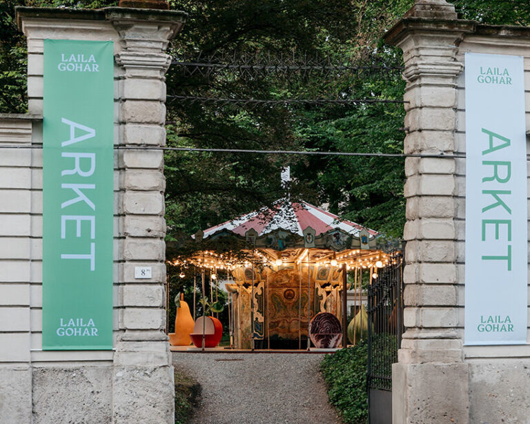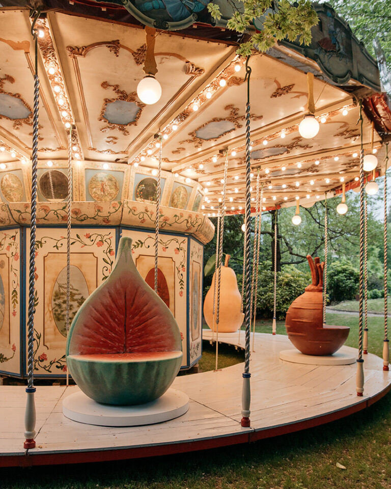 埃及裔美國藝術家 Laila Gohar 於 Giardino delle Arti 藝術花園 發表與北歐極簡設計生活品牌 ARKET 合作的公共裝置,以改造的18世紀旋轉木馬為核心。她將傳統馬匹替換為巨型水果與蔬菜,透過尺度放大與材質轉換,打造介於童趣與舞台感之間的超現實場景。熟悉物件被重新組構,在緩慢旋轉中形成重複與變化,改變觀者感知,同時保留其日常本質。