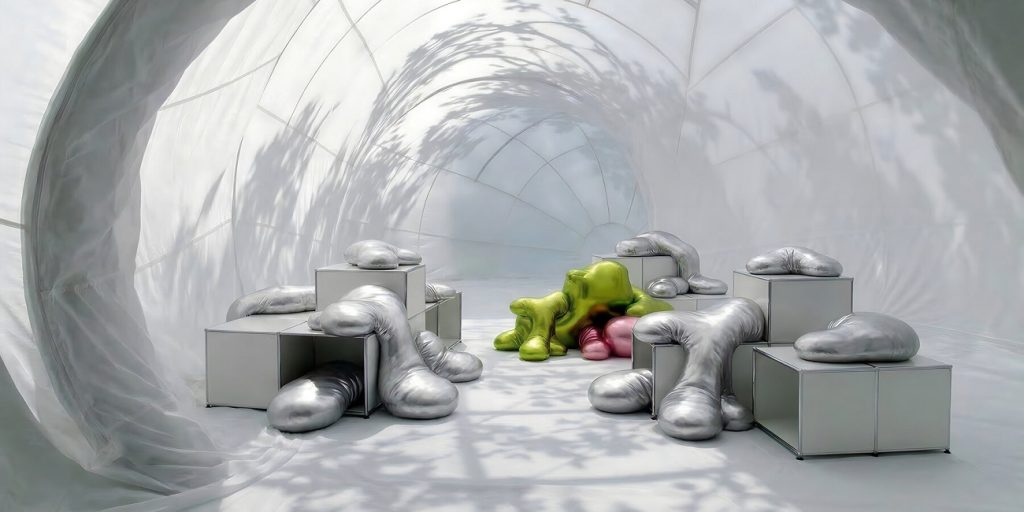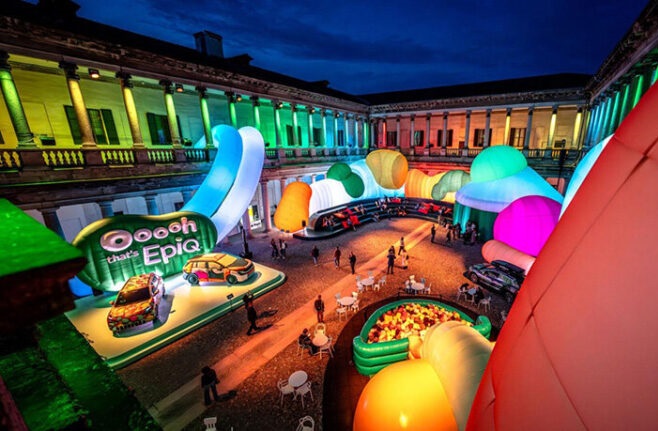 Ulises Studio 於米蘭參議院宮打造充氣裝置《Wow! That’s EpiQ!》,以橡皮泥般柔軟、多彩的造型轉化歷史庭院為沉浸式互動景觀。設計由建築師Ricardo Orts 構思,將汽車品牌 Škoda 品牌語彙轉譯為可遊走、可停留的空間,不僅是兒童遊樂場,也成為成人放鬆與社交的場域。中央展示全新電動車 Škoda Epiq 車款與雕塑,結合數位敘事與LED光影,形塑多層次體驗。