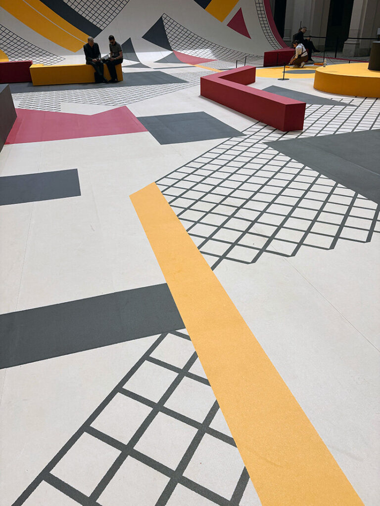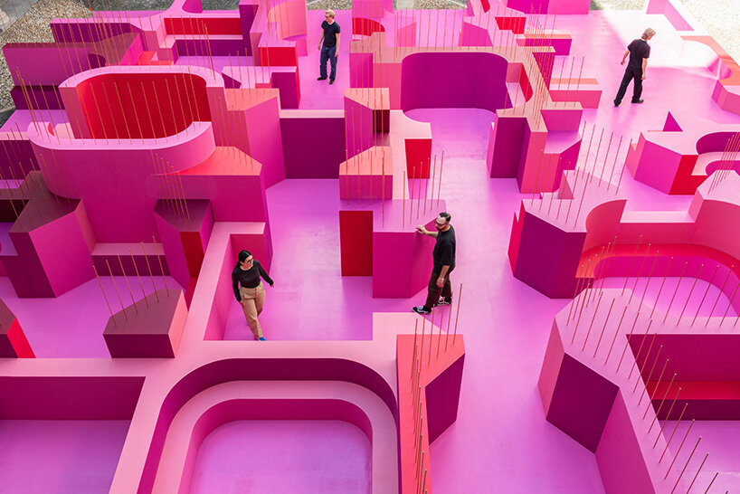黎巴嫩建築師 Lina Ghotmeh 在17世紀巴洛克建築麗塔宮 ( Palazzo Litta ) 內的 Cortile d’Onore 中庭,打造粉紅迷宮裝置《Metamorphosis in Motion》。作品以高飽和粉紅色構築庭院空間,透過階梯、平台與隔間形成連續而開放的迷宮場域,徹底改變人們對巴洛克建築的既有感知。此裝置沒有固定觀賞路徑,觀眾可自由穿梭、停留與觀察,使空間在行走與互動中持續被重構。從高處俯瞰,整體如同平面圖轉化為立體結構,呈現圖底反轉的空間邏輯。設計刻意引入「慢節奏」,提供觀者在設計週密集活動中暫停、沉浸與探索的場域。