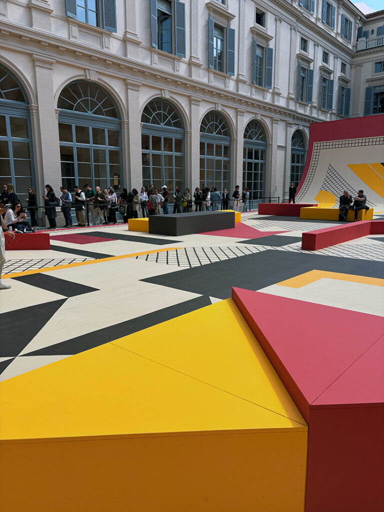 路易威登 ( Louis Vuitton ) 於塞爾貝羅尼宮 ( Palazzo Serbelloni ) 打造沉浸式展覽,融合裝飾藝術歷史與當代設計。呈現《Objets Nomades》系列與經典旅行箱,透過場景化空間敘事,串聯品牌從旅行工藝到收藏設計的演變。庭院設置受裝幀大師 Pierre Legrain 啟發的大型可步行地毯裝置作品,由布雷拉美術學院 ( Accademia di Brera ) 學生製作,將書籍圖紋轉化為建築表面,連結傳統工藝與當代教育。