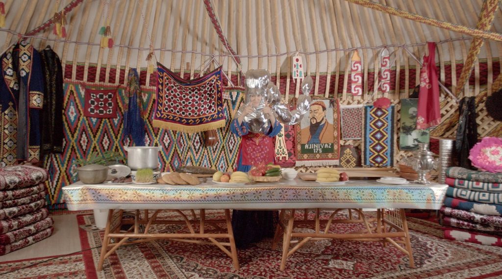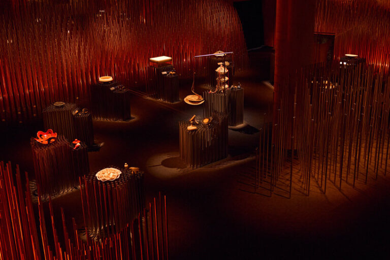 庭院空間以傳統床墊與紡織品構成自由座席,強調人與人之間的互動;室內則透過蘆葦狀結構分隔空間,營造層層遞進的觀看節奏。展覽同時結合飲食、工具與工藝,如麵包印章與材料實驗,展現設計與日常生活的連結。整體以材料、記憶與文化為主軸,透過空間敘事回應鹹海地區的環境變遷,呈現工藝如何在當代持續演化並融入建築與設計之中。