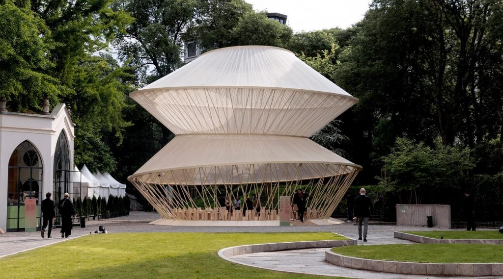 由 烏茲別克藝術文化發展基金會 ( ACDF ) 發起的《當杏花盛開時 When Apricots Blossom》展覽於奇特里奧宮 ( Palazzo Citterio ) 登場,強調將傳統工藝轉化為建築語言。展覽橫跨街道、庭院與室內空間,呈現工藝、生活與環境之間的緊密關係。核心裝置為 wHY Architecture 設計、靈感源自蒙古包的輕盈展館,以格柵結構與半透明外皮構成,白天過濾光線、夜晚柔和發光,成為活動與交流的場域。建築立面則覆以垂掛織品與流蘇,延伸室內語彙至城市街景,模糊內外界線。