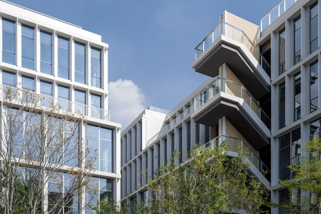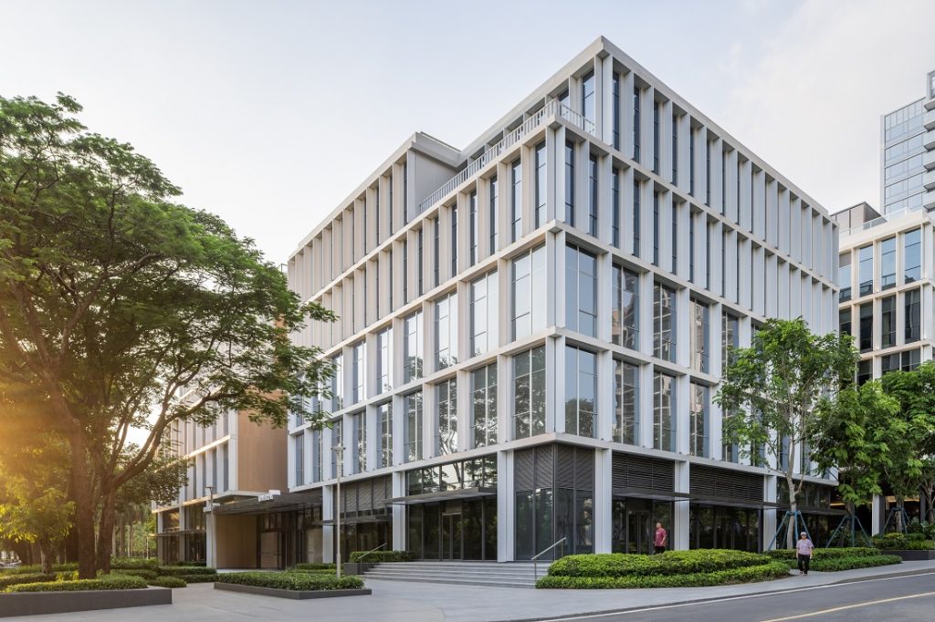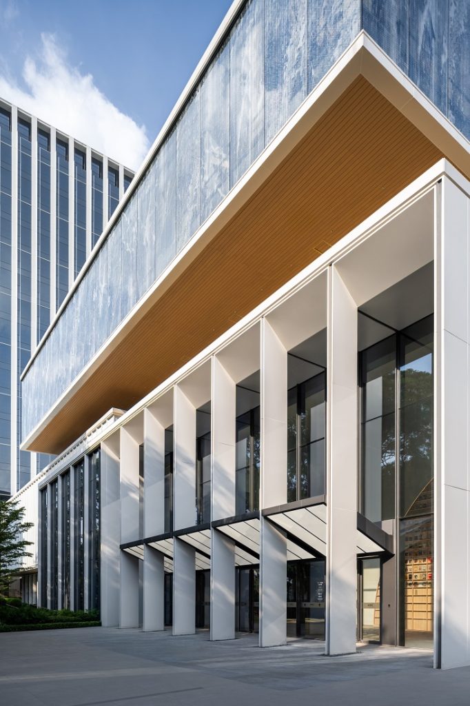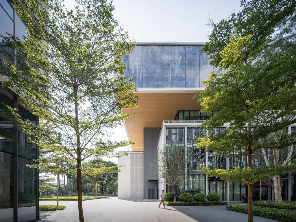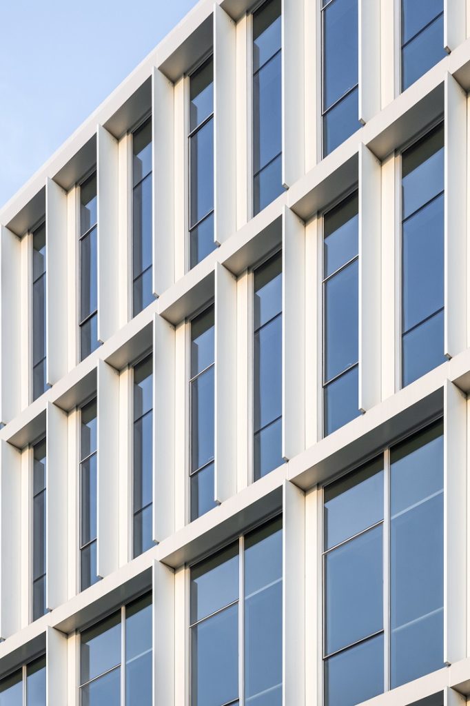 立面採用白色鋁板與纖細遮陽肋片,有效降低日照負荷,使室內擁有更柔和且節能的光環境;垂直天井與透明流線則強化自然採光與通風,使大樓成為兼具健康性、效率與永續性的未來辦公空間範例。